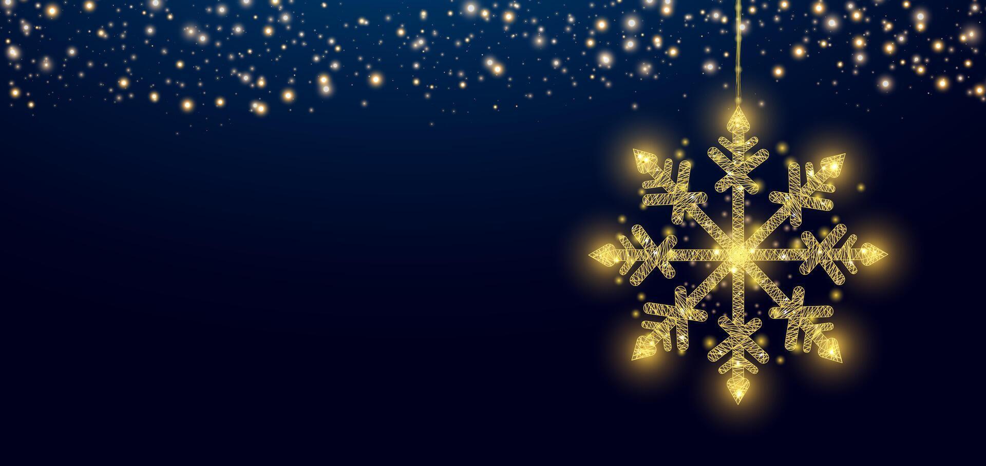 Hanging wireframe gold snowflake in low poly style. Christmas and New Year concept. Abstract modern illustration on bokeh background Pro Vector