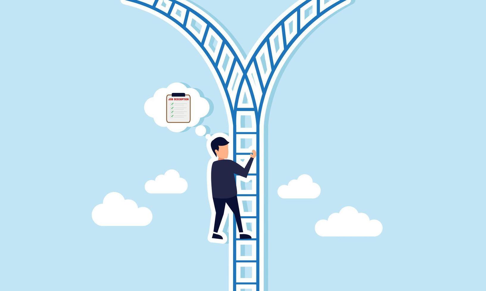 A businessman climbs a branching staircase while contemplating a job description board, illustration of analysis in executing business according to the job description Pro Vector
