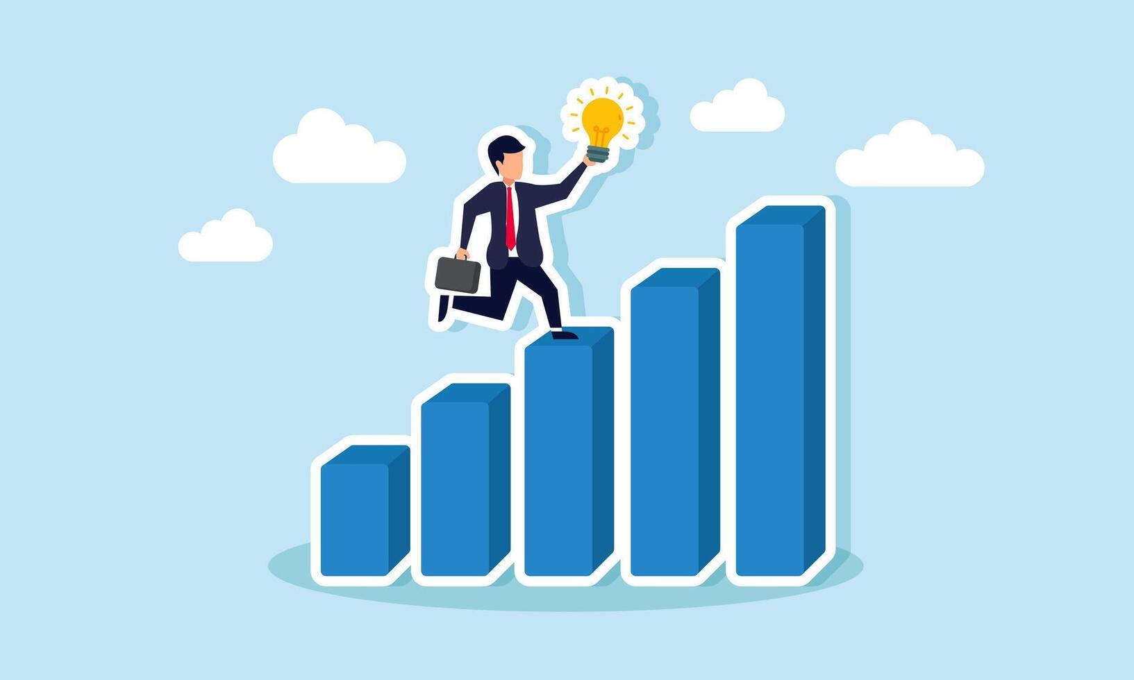 A businessman runs up a graph carrying a lit lamp, illustration of business performance progress driven by innovative ideas Pro Vector