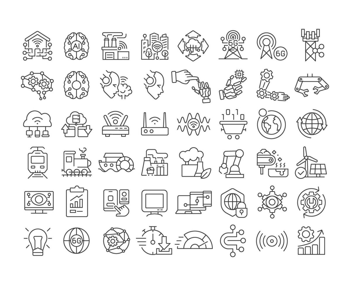 Industry 5.0 linear icons set. Artificial intelligence. Automation. Smart factories. Digital transformation. Customizable thin line symbols. Isolated outline illustrations. Editable stroke Pro Vector