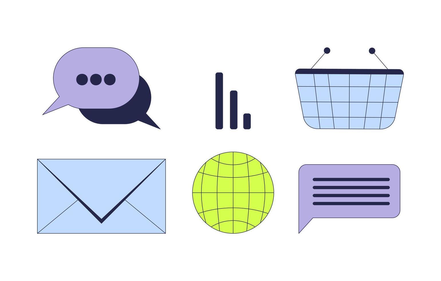 Digital communication social network 2D cartoon objects set. Online media analysis. Basket. Messaging email isolated elements flat cliparts on white background. Spot illustrations collection Pro Vector