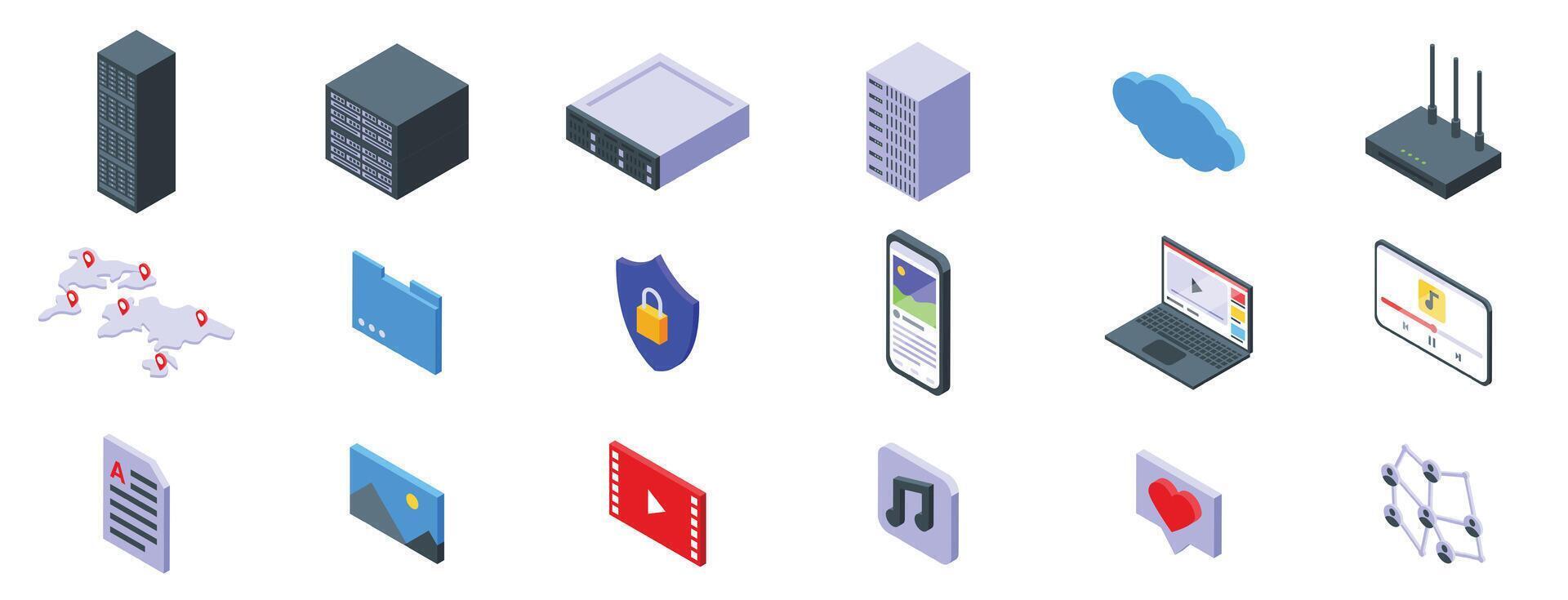 CDN icons set. Data storage and communication, exploring cloud computing, server farms, and network connectivity Pro Vector