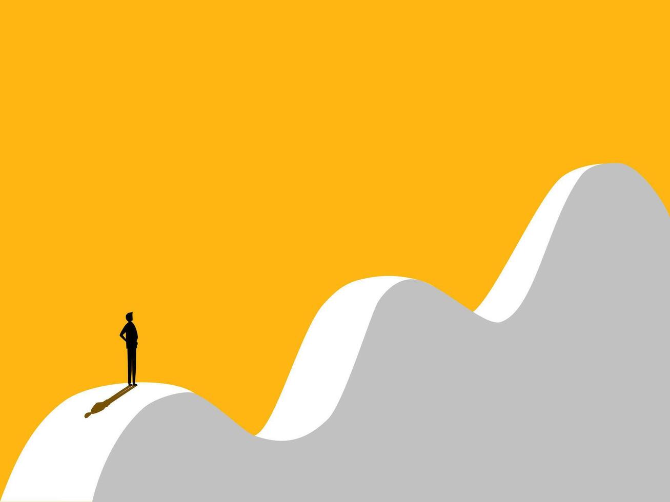 a man stands on top of a mountain with a arrow pointing down Pro Vector