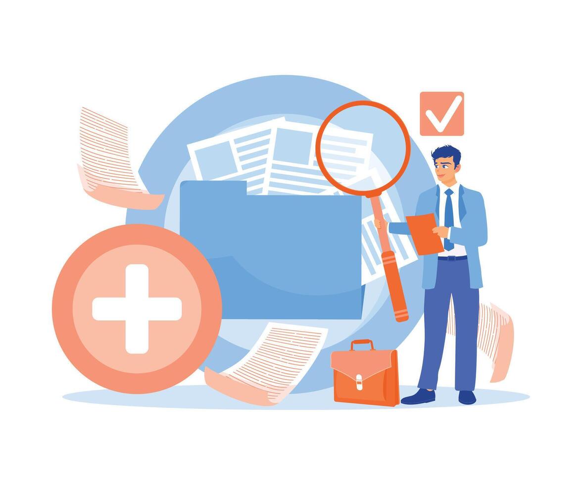 Businessman storing files on a digital server. Workers add files to large folders. Storage concept. Flat illustration. Pro Vector