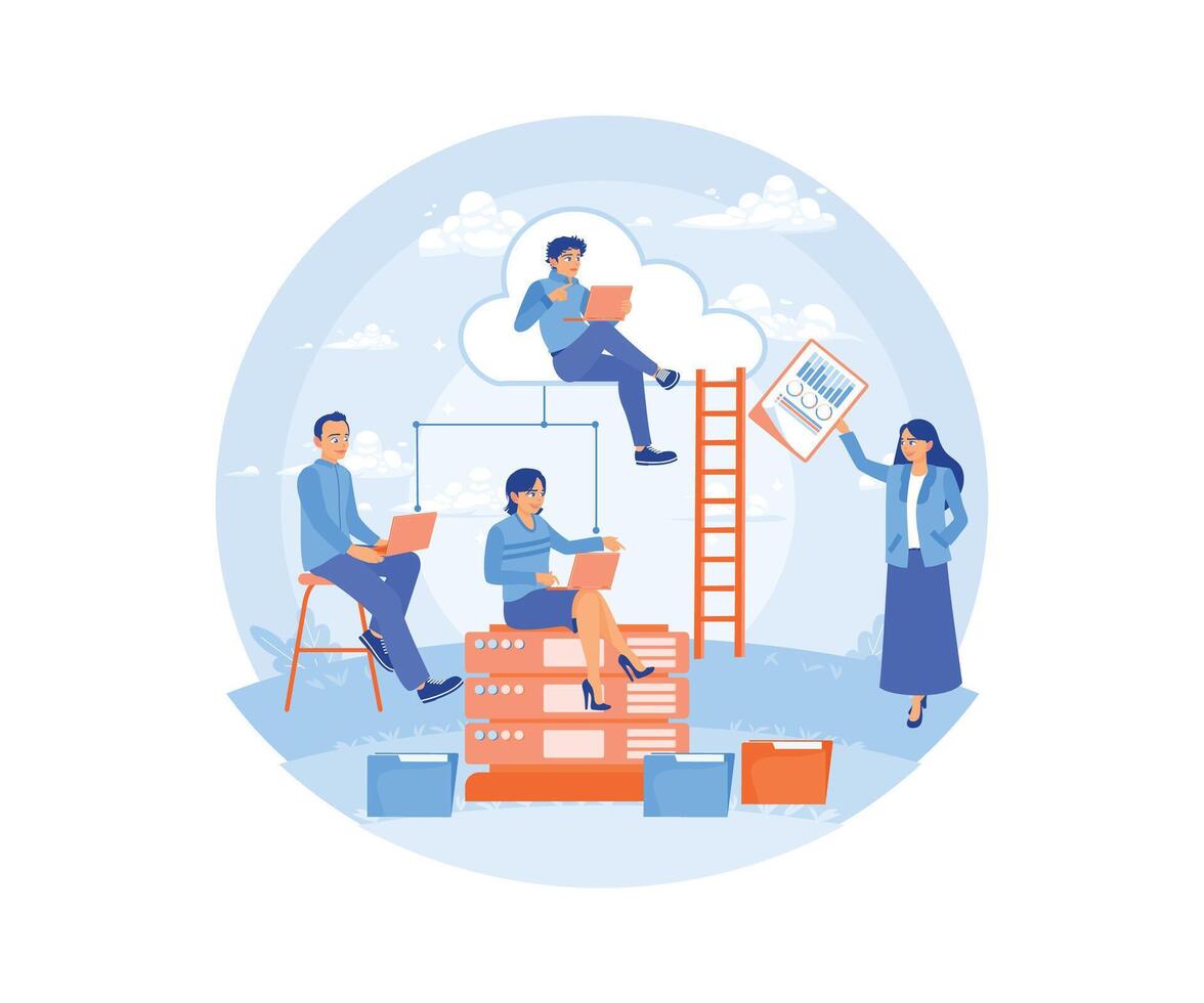 People work using electronic devices. Using cloud computing services to store data. Storage concept. Flat illustration. Pro Vector