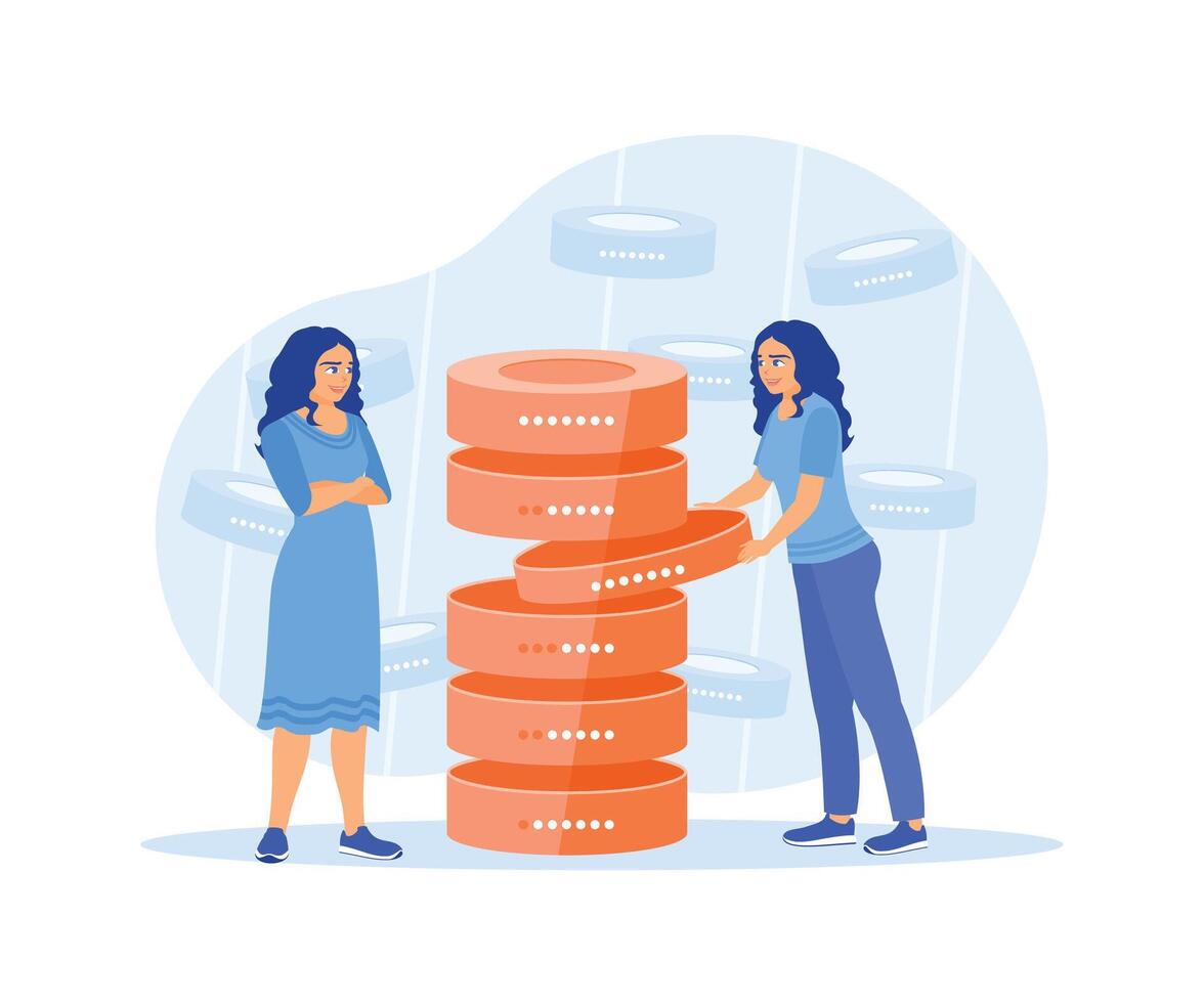 Woman holding server hardware. Save and search for files in the main file. Database concept. Flat illustration. Pro Vector