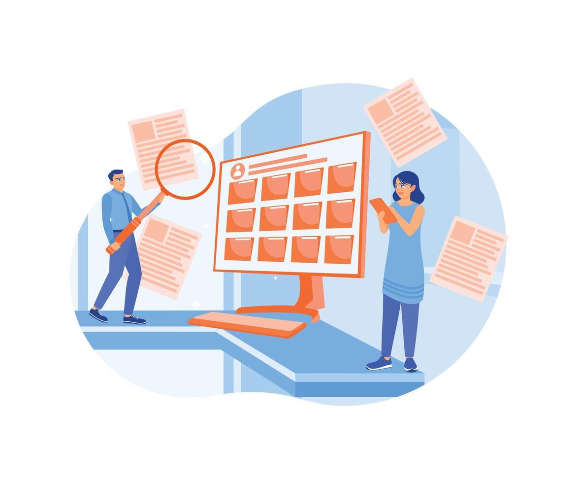 People save files in file managers. Employees search and index file documents. Storage concept. Flat illustration. Pro Vector