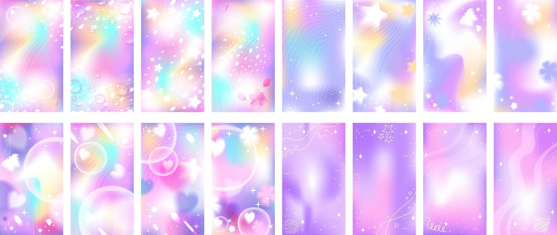 Trendy set of purple mesh gradient storis template background with copy space and hand drawn anime Y2K smooth elements. Ideal for use on social media. Pro Vector