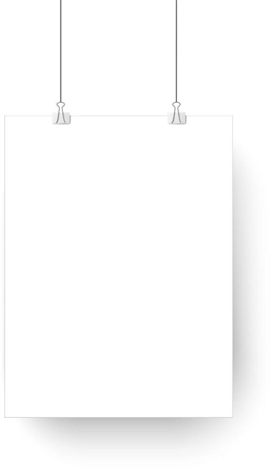 Two metal clips hanging on strings are holding a blank white sheet of paper providing copy space on a white background with slight shadow Pro Vector