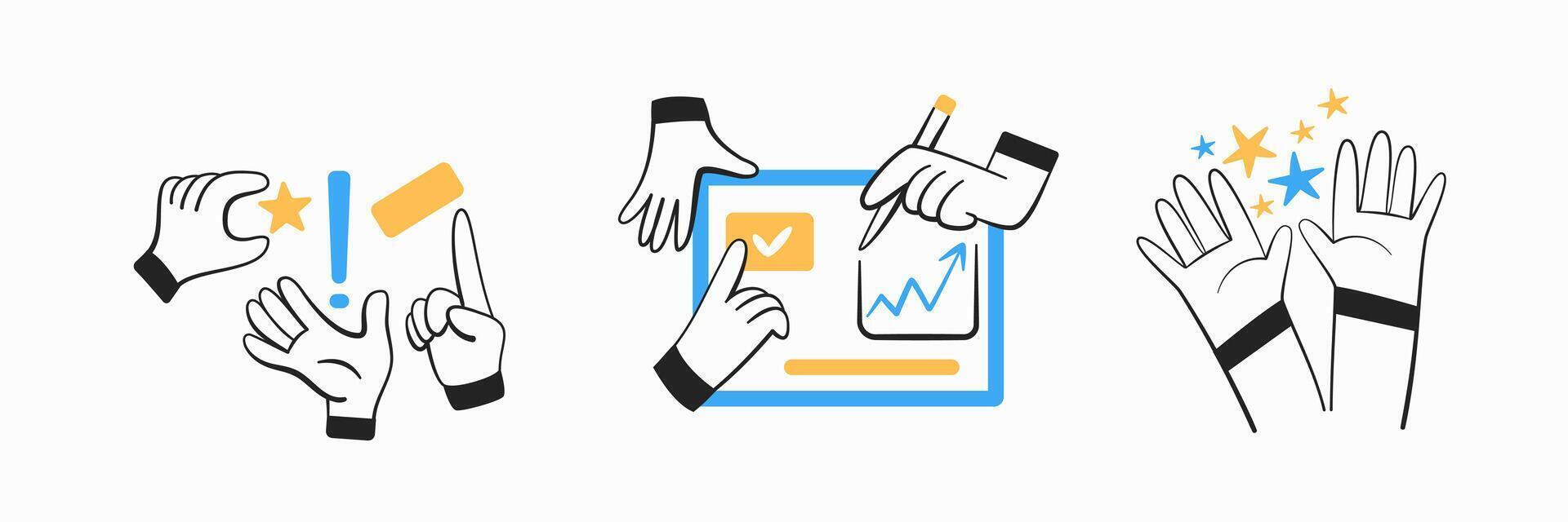 Set of icons with hands about management, setting a task, finding a solution, success. Pro Vector