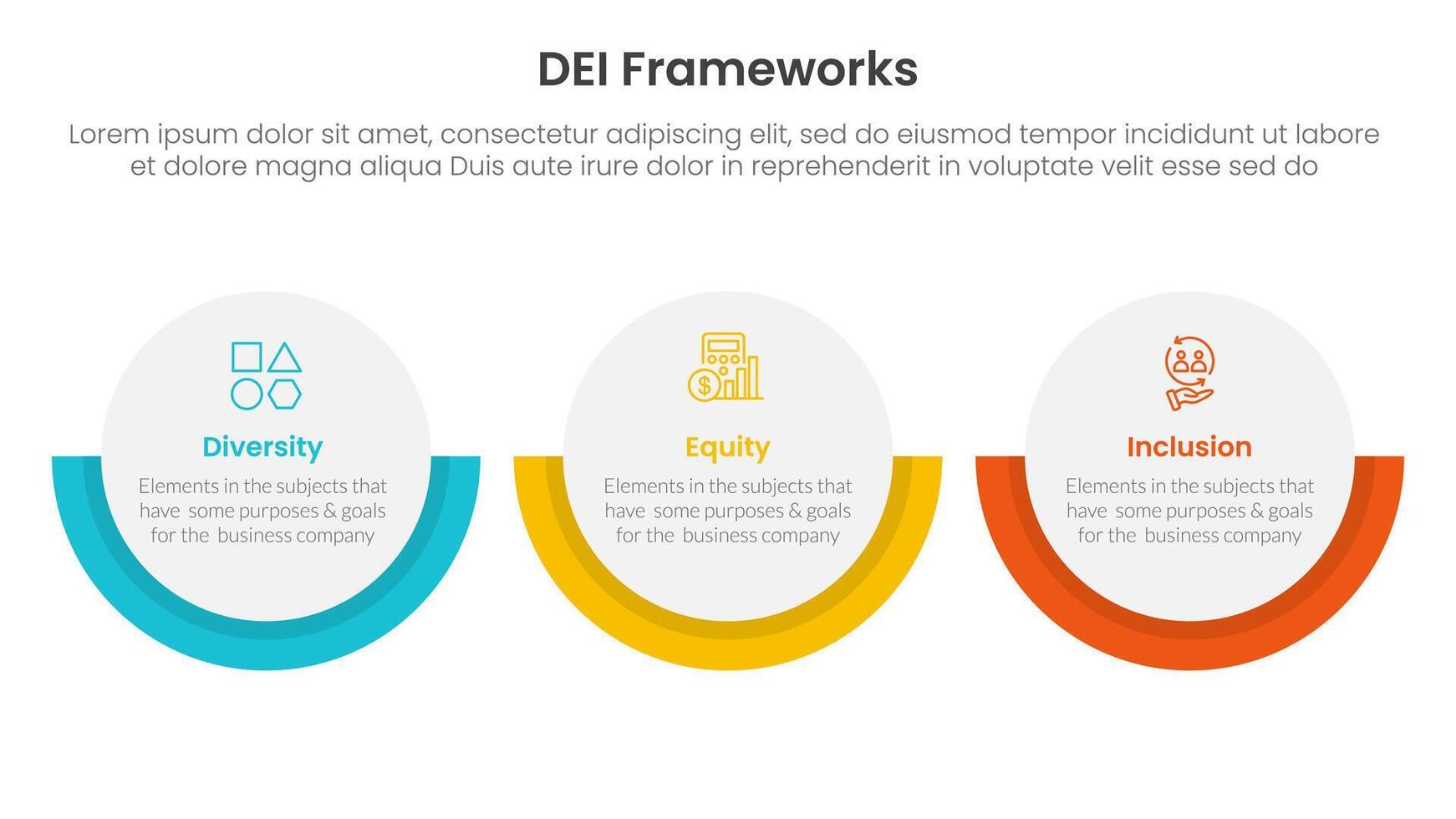 DEI organizational frameworks infographic 3 point with big circle horizontal layout for slide presentation Pro Vector