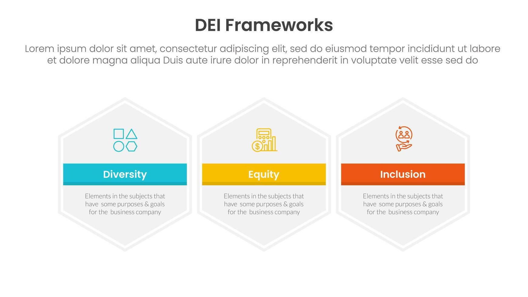 DEI organizational frameworks infographic 3 point with big hexagon hexagonal horizontal for slide presentation Pro Vector