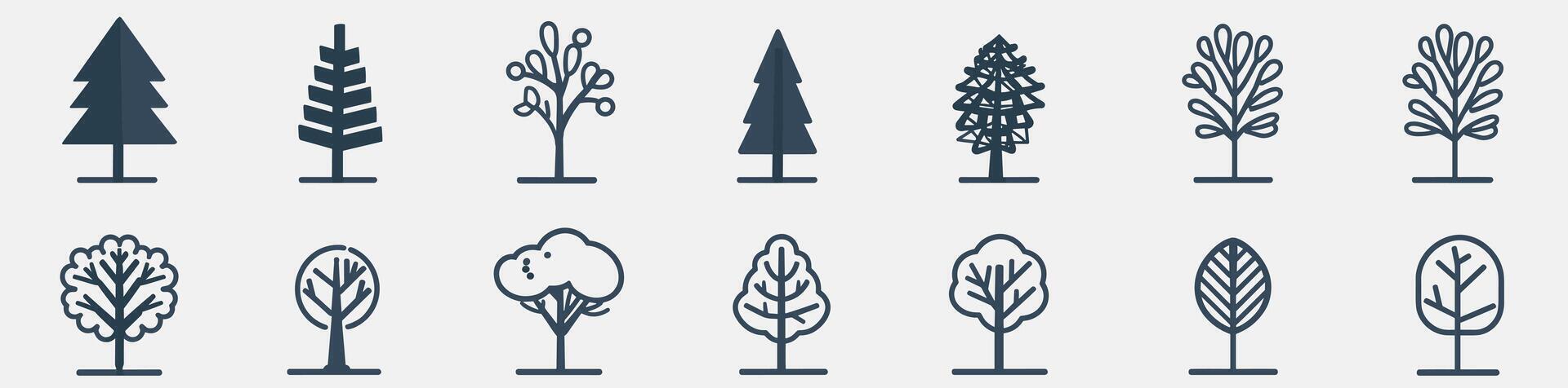 Illustrated tree icons depicting various tree shapes and styles in a minimalist design. Pro Vector