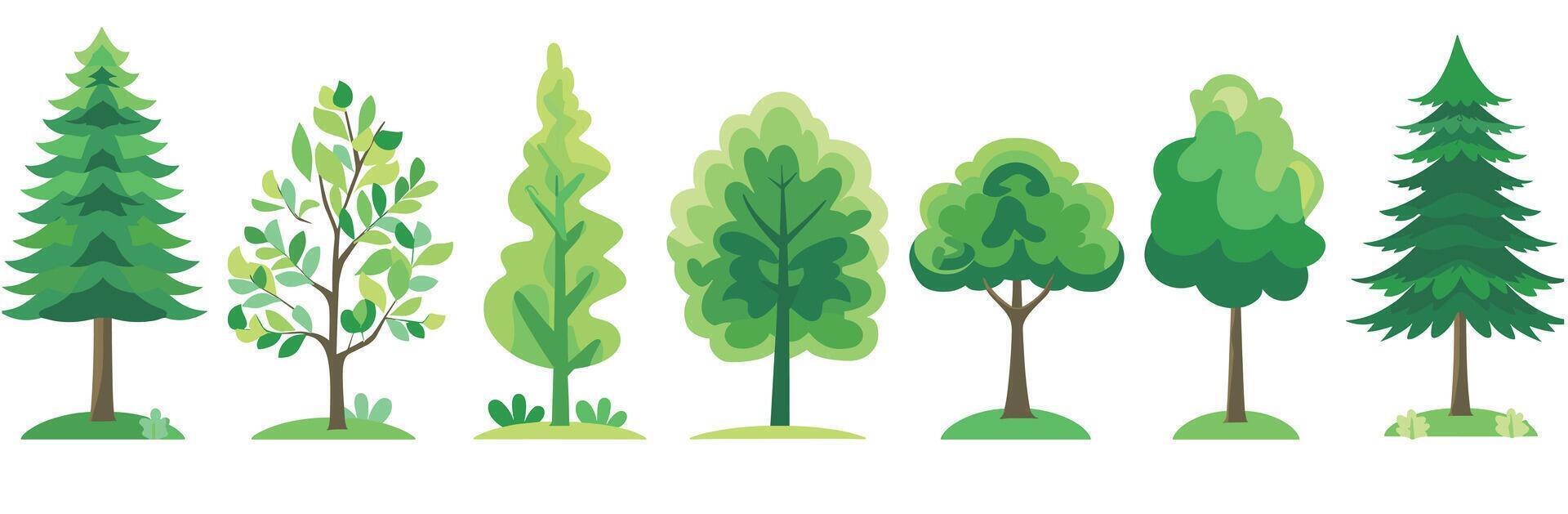 Illustration of various green trees, showcasing different shapes and foliage styles on a white background. Pro Vector