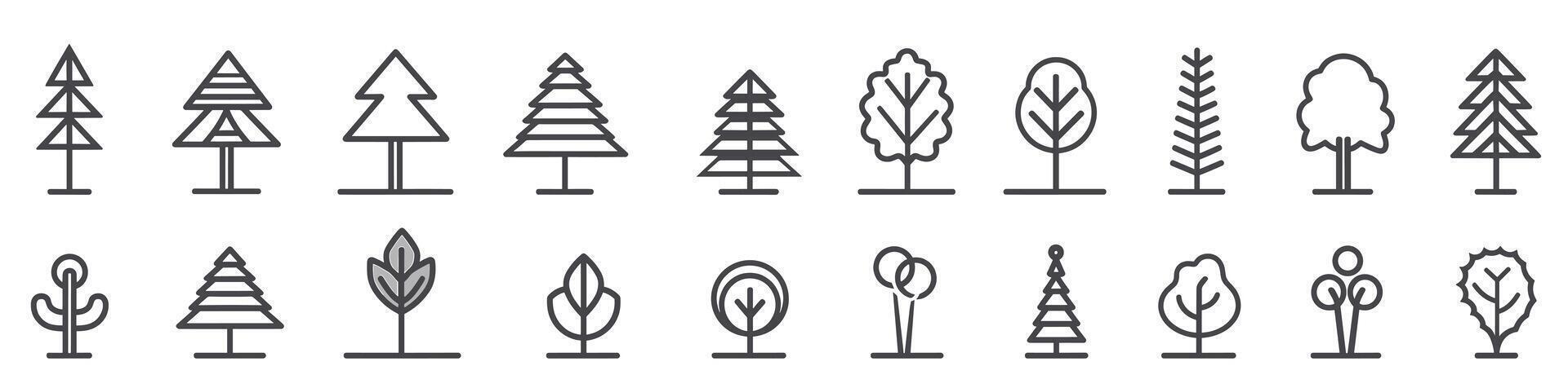 Minimalistic line drawings of various tree designs in black on a white background. Pro Vector