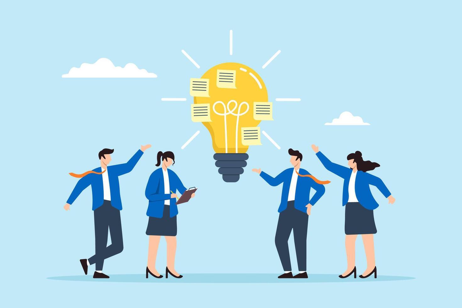 Flat illustration of business people brainstorming with sticky note on bright lightbulb idea effective team meeting discover solution Pro Vector