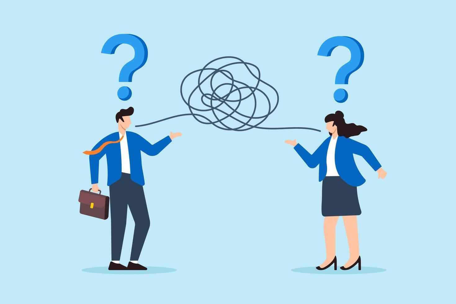 Flat illustration of two business colleagues communicate through messy line with question mark misunderstanding confusion conflict opinion discussion meeting conversation Pro Vector