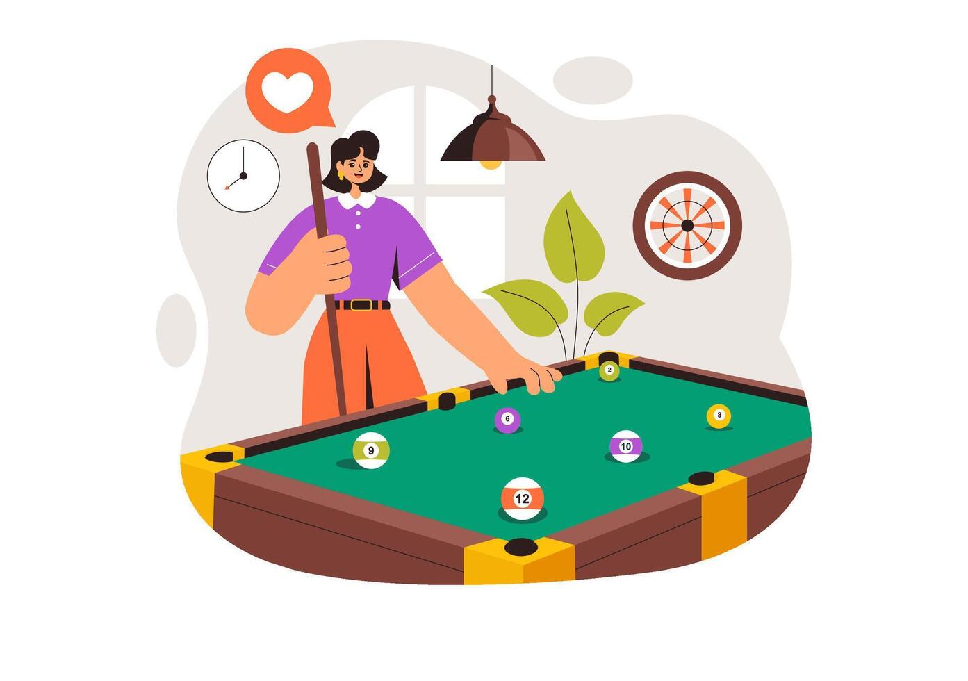 Flat Style Cartoon Illustration of a Pool Game with Table, Cue Stick, and Balls in a Club Pro Vector