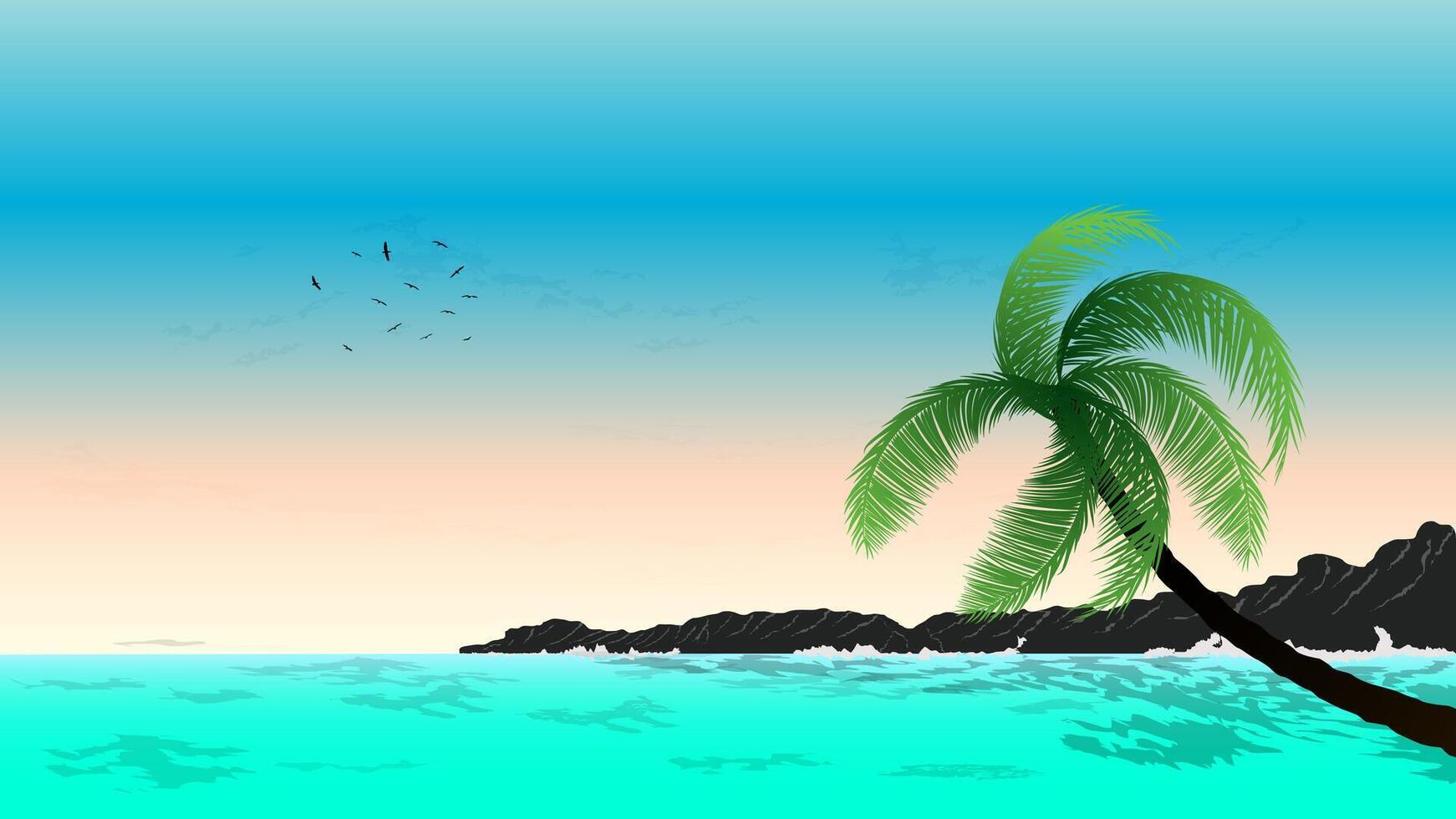A serene beach scene with a leaning palm tree, blue sky, white clouds, and a flock of birds. The turquoise ocean waves gently lap against the shore Pro Vector