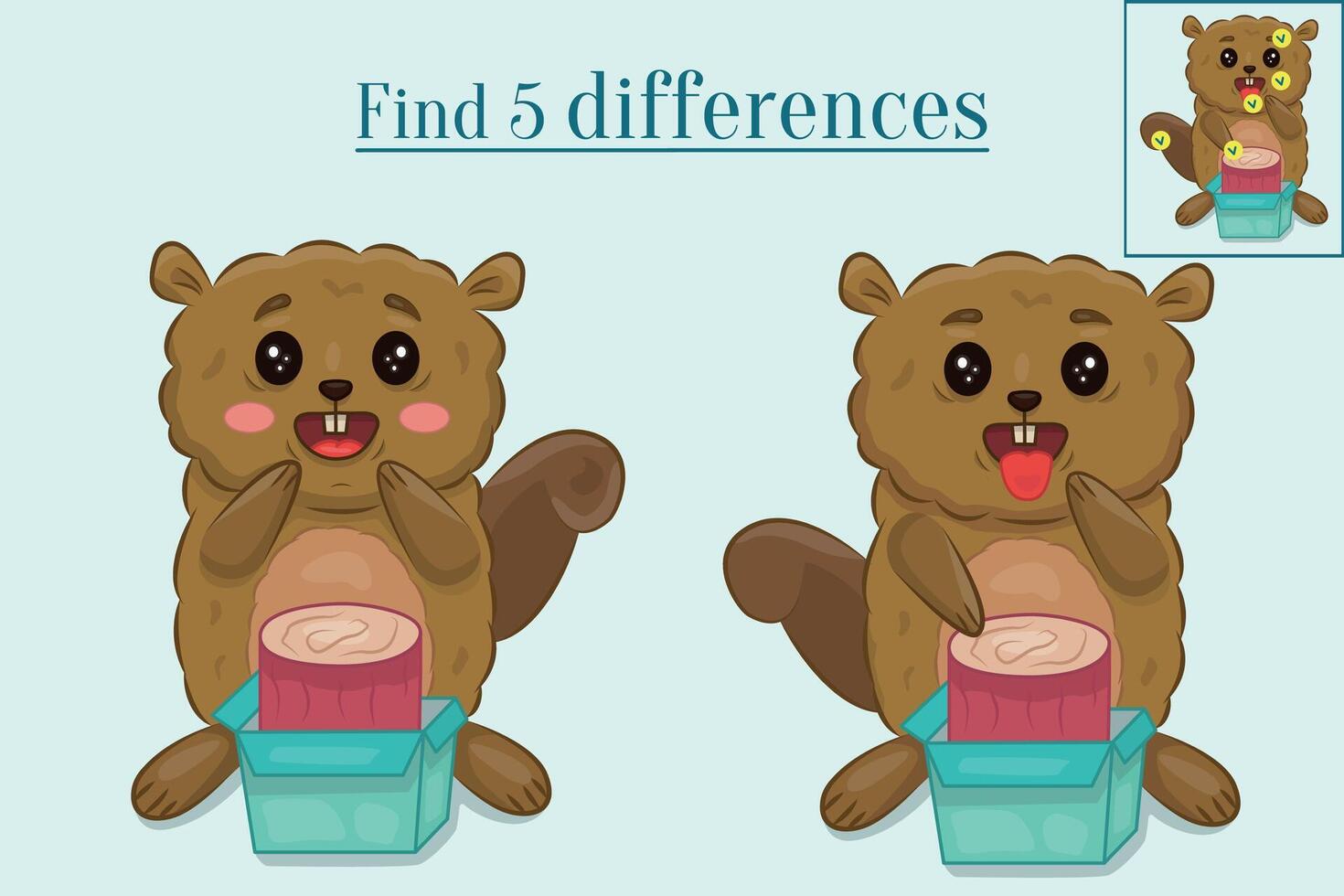 Find five differences from animals, compare two beavers and find the differences. This is an educational game for kids.A page with training materials. Preparing for school. illustration Pro Vector