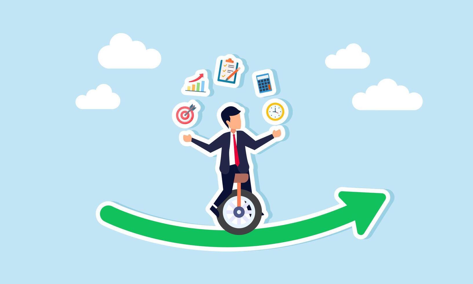 A businessman riding a unicycle on an upward green curve graph, juggling business management items, illustration of maintaining team management stability and efficiency Pro Vector