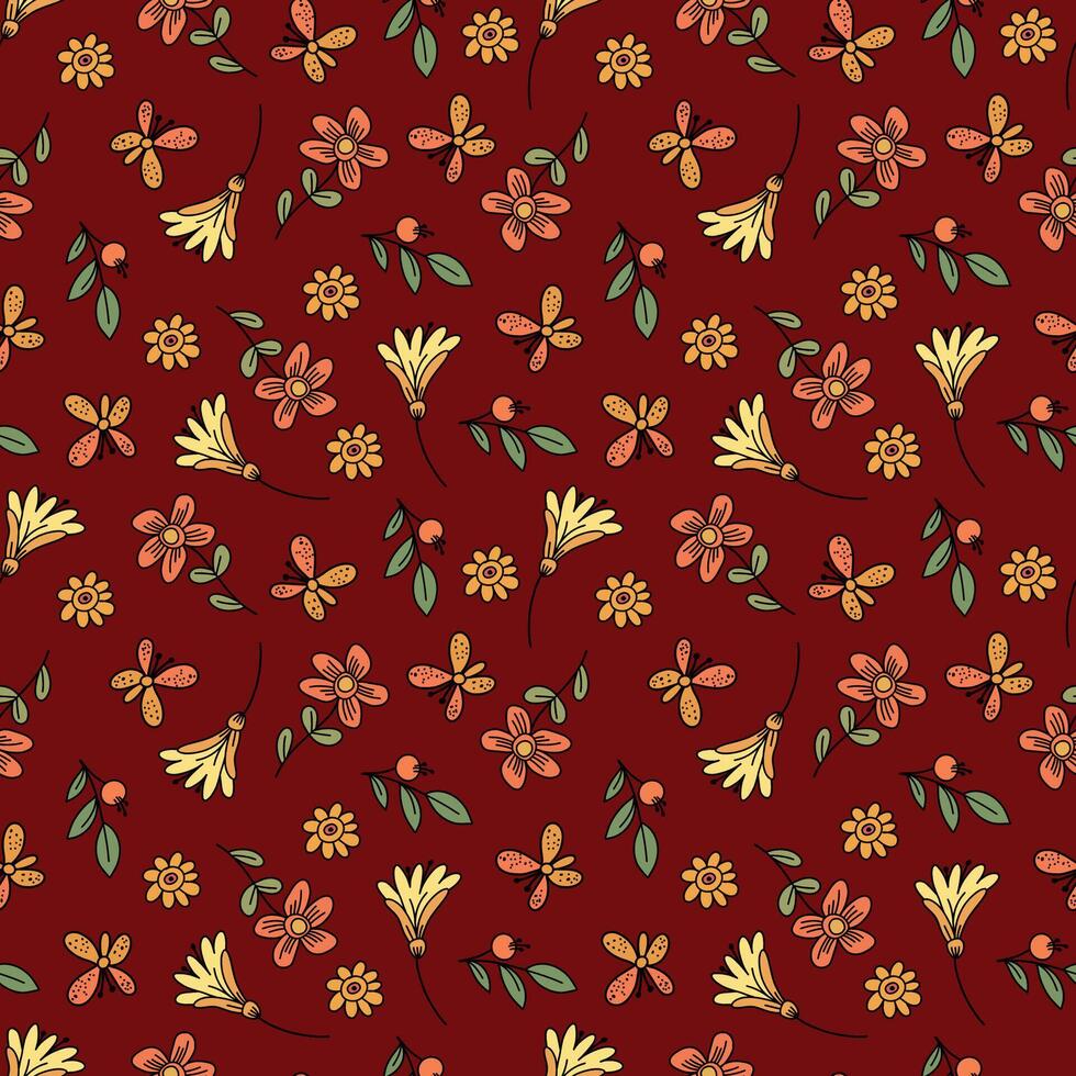A pattern of small flowers and leaves. Seamless fabric background with a bohemian pattern in the form of small flowers. Pro Vector