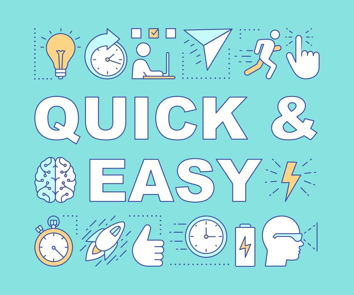 Quick and easy word concepts banner. Digital solutions. Fast service. Online business benefit. Presentation, website. Isolated lettering typography idea with linear icons. Vector outline illustration Pro Vector