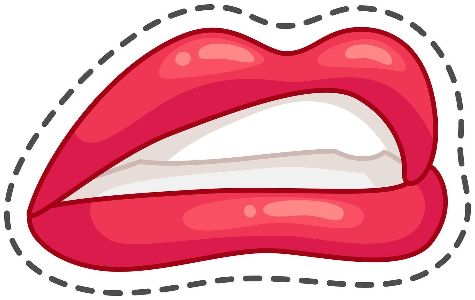 Cartoon illustration of red lips slightly parted showing teeth biting down, isolated on white background with black dashed cut out outline Pro Vector