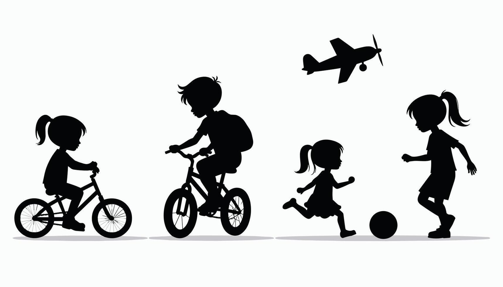 Silhouette of children in playful activities, showcasing biking, running, and playing with a ball. A toy airplane flies above, symbolizing imagination and joy. Pro Vector