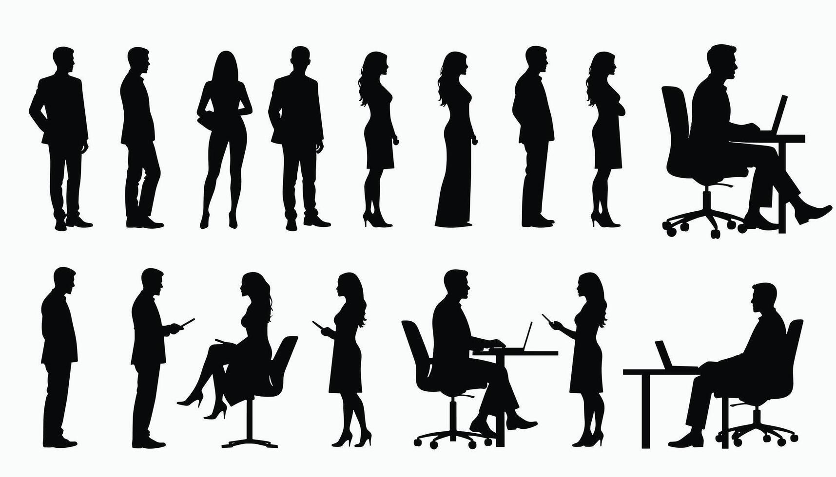 Silhouettes of diverse professionals engaged in various office activities, reflecting collaboration and communication in a modern workspace setting. Pro Vector