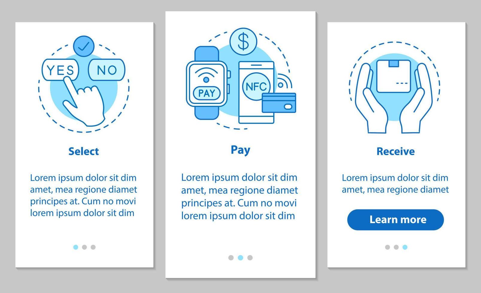 Online shopping onboarding mobile app page screen with linear concepts. Select, e-payment, receive parcel steps graphic instructions. UX, UI, GUI vector template with illustrations Pro Vector