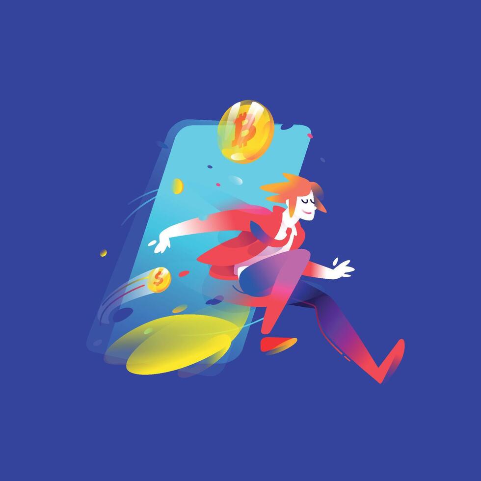 Illustration of a running man with coins bitcoin. A bright and harezmatic character. Image is isolated on white background. Flat illustration for banner, presentation and site. Pro Vector