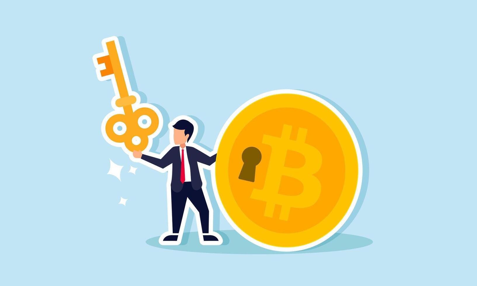 A businessman holding a key stands beside a bitcoin with a keyhole, illustration of finding solutions through the application of analysis and bitcoin investment strategies Pro Vector