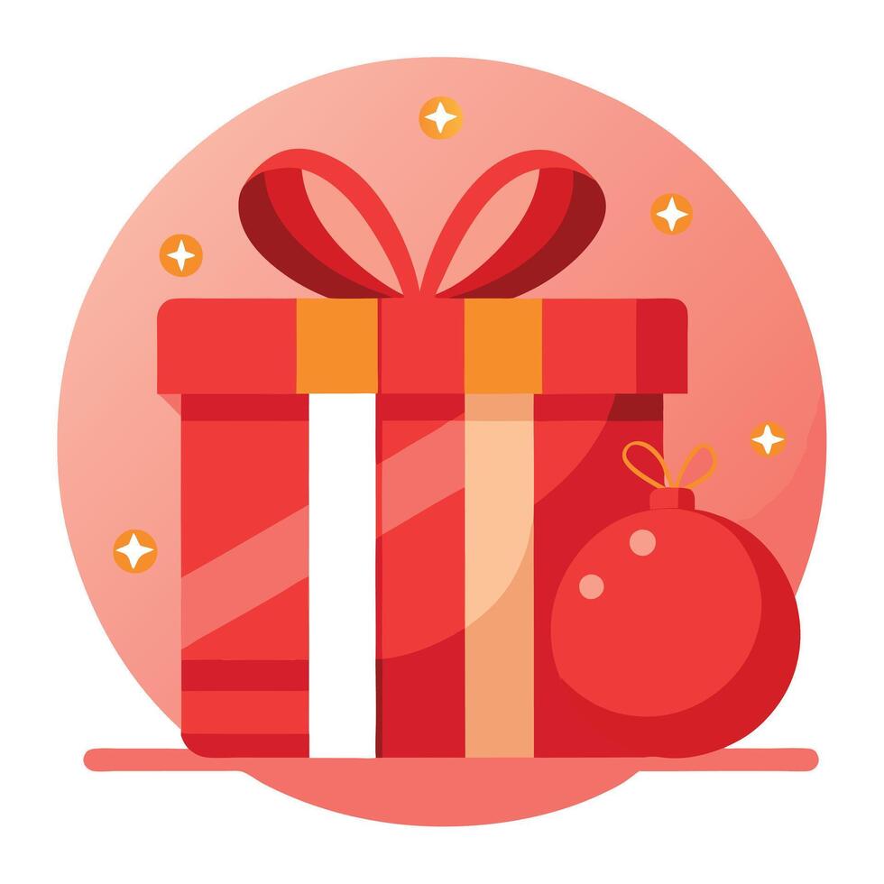 Gift box with red ribbon and red christmas ball in front of bokeh red background. Pro Vector