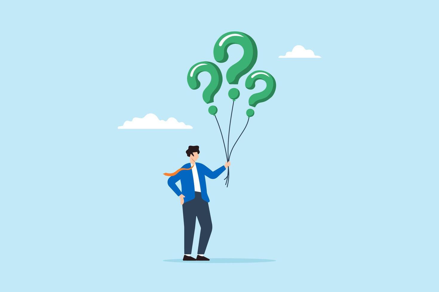 Flat illustration of doubtful businessman hold question mark balloon finding and searching solution answer and solving problem Pro Vector