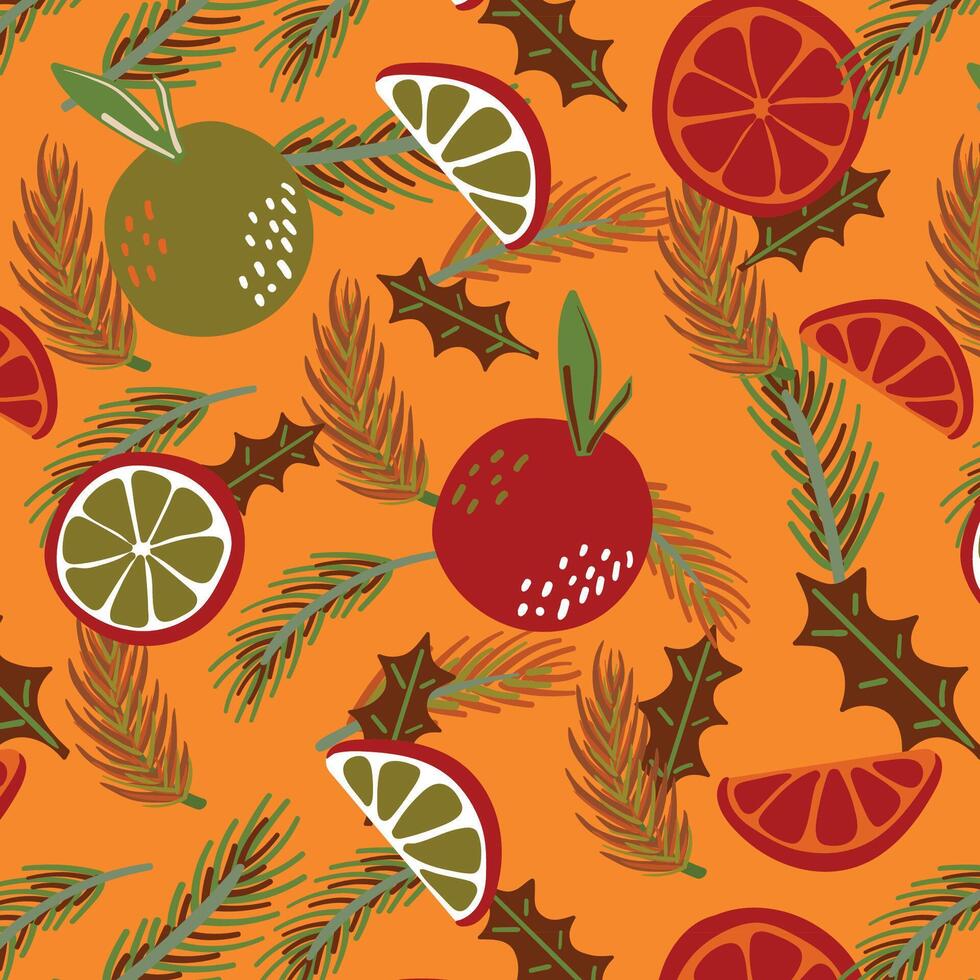 A pattern with oranges, holly leaves and fir branches on an orange background Pro Vector