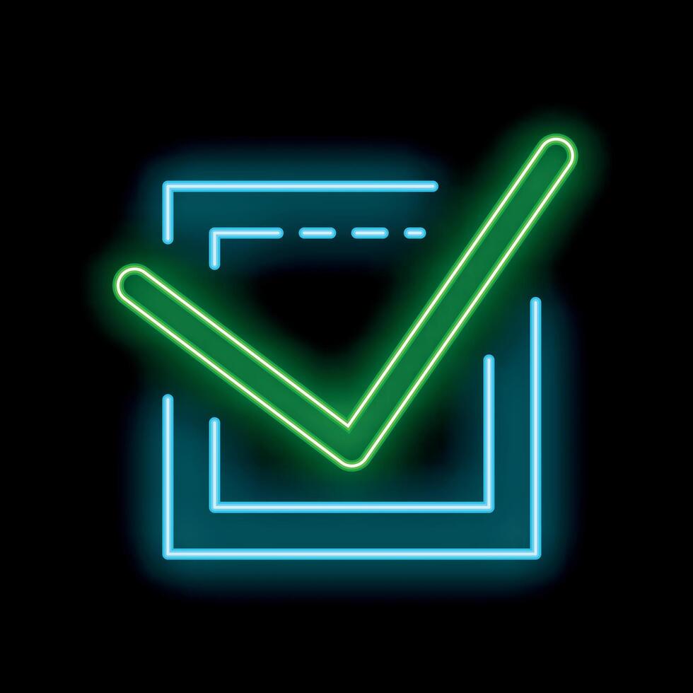 Neon green check mark in blue checkbox glowing on black background Pro Vector