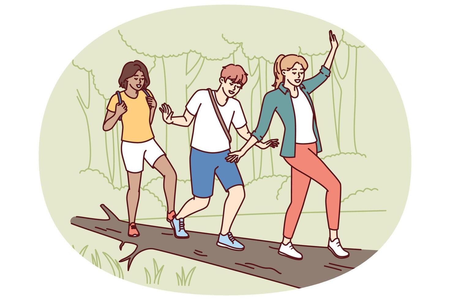 Group of friends participate in hike balancing on log thrown across river instead of bridge Pro Vector