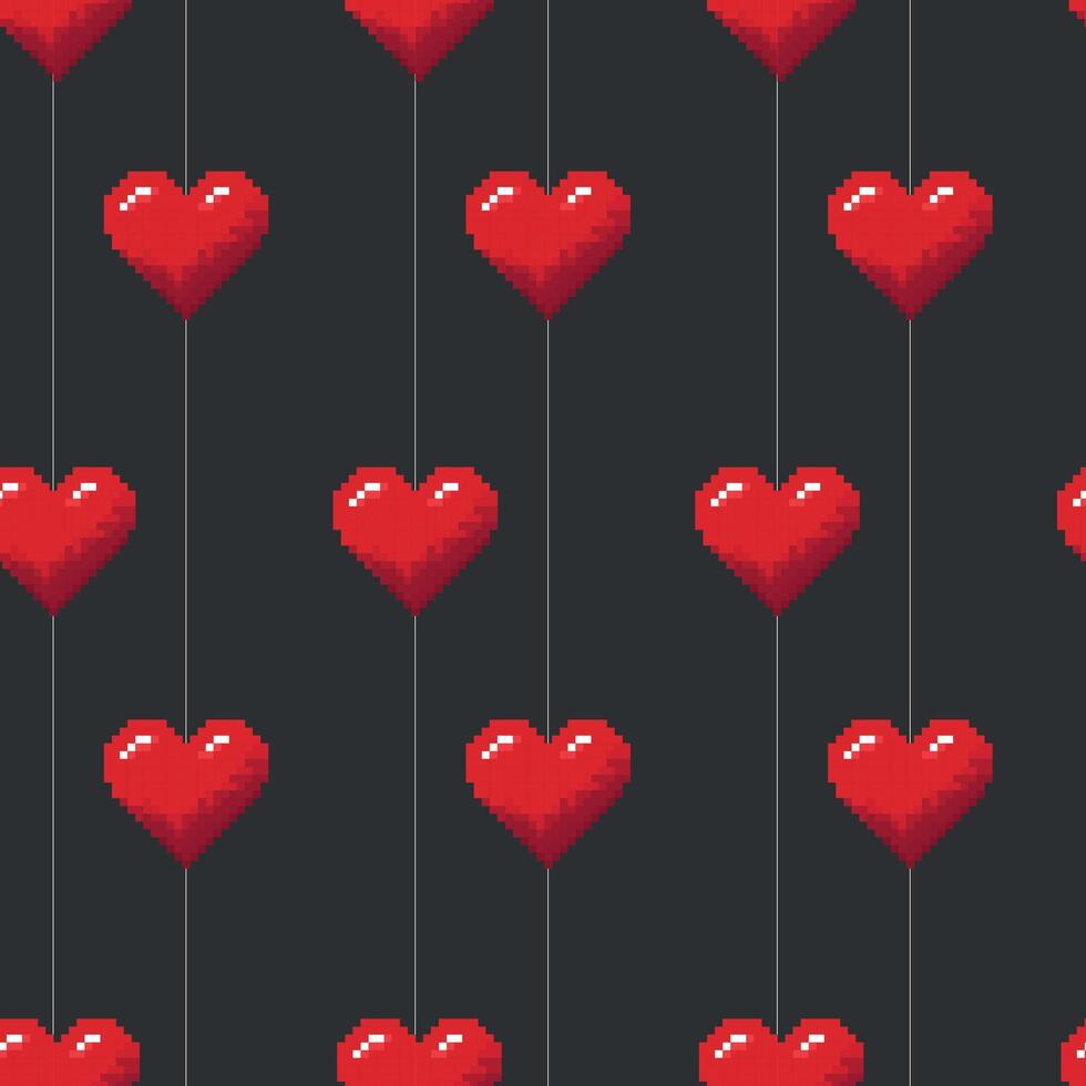 A seamless pattern featuring classic red pixel heart icons on a dark background, designed in 8-bit retro pixel art style. Perfect for nostalgic and gaming-themed projects. Pro Vector