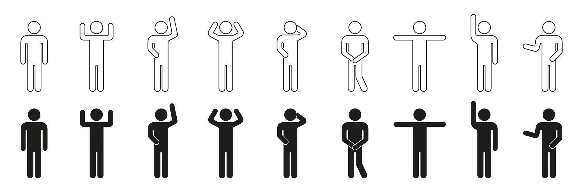 Man Figure Line and Silhouette Icon Set in Various Poses. Stick Figure with Different Gesture and Pose Collection. Editable Stroke. Isolated Illustration Pro Vector
