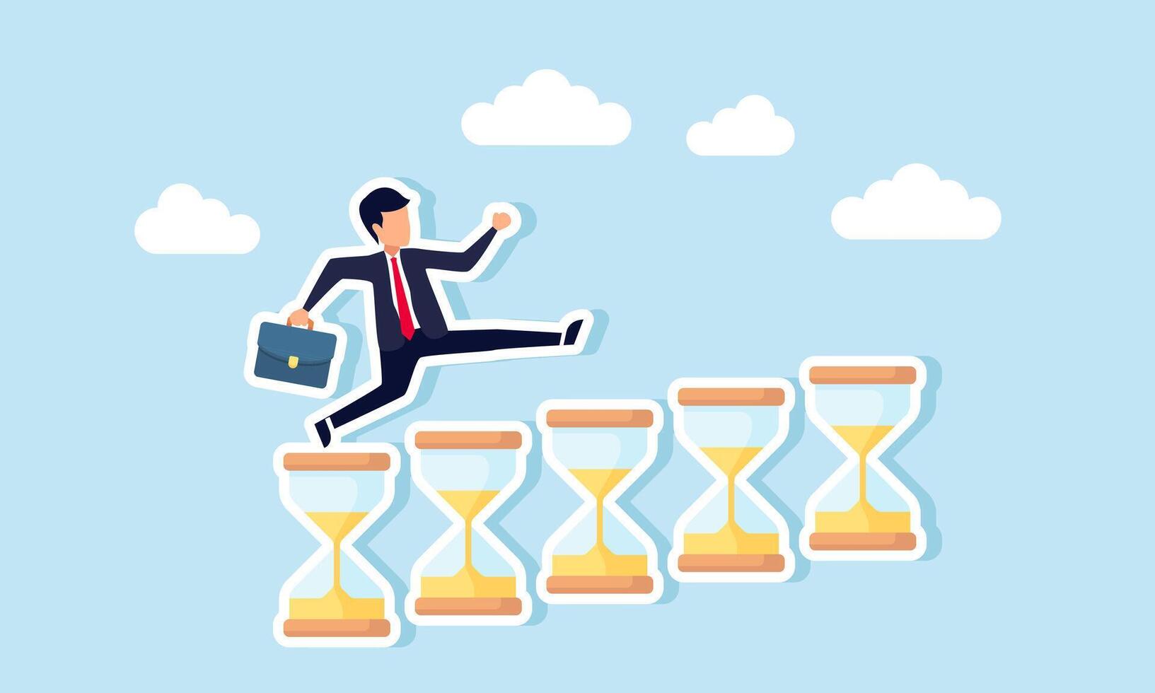A businessman runs and leaps over a row of hourglasses, illustration of being chased by time to complete multiple business projects simultaneously Pro Vector