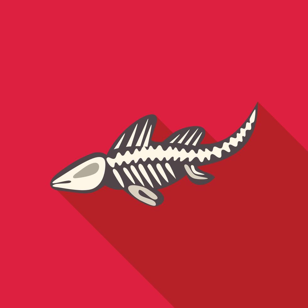 Fish skeleton representing extinct aquatic animal fossil on red background Pro Vector