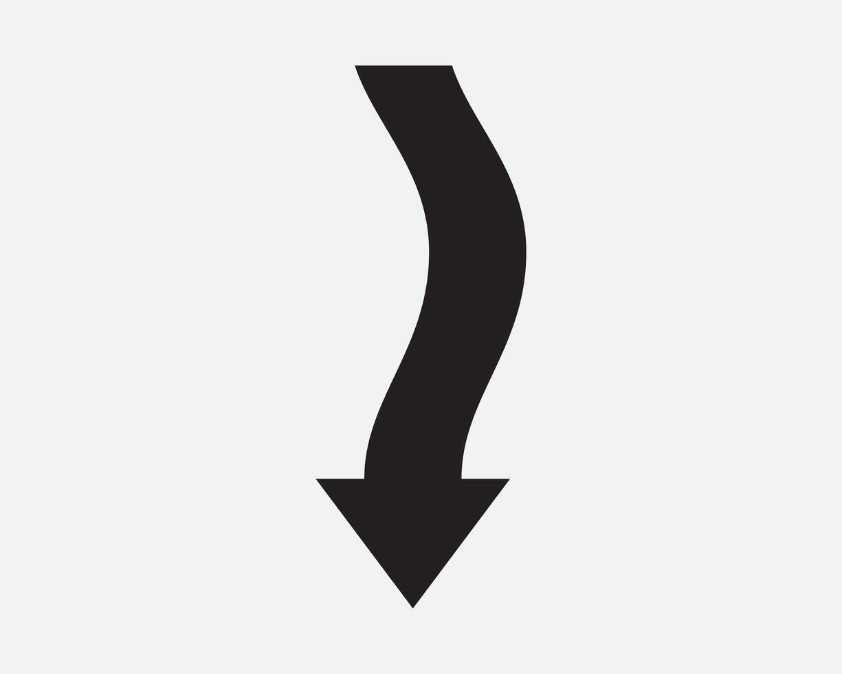 Wavy Arrow Point Down Pointing South Below Under Reverse Descent Backwards Back Curve Flow Downstream Aim Black White Sign Icon Shape Outline Pro Vector
