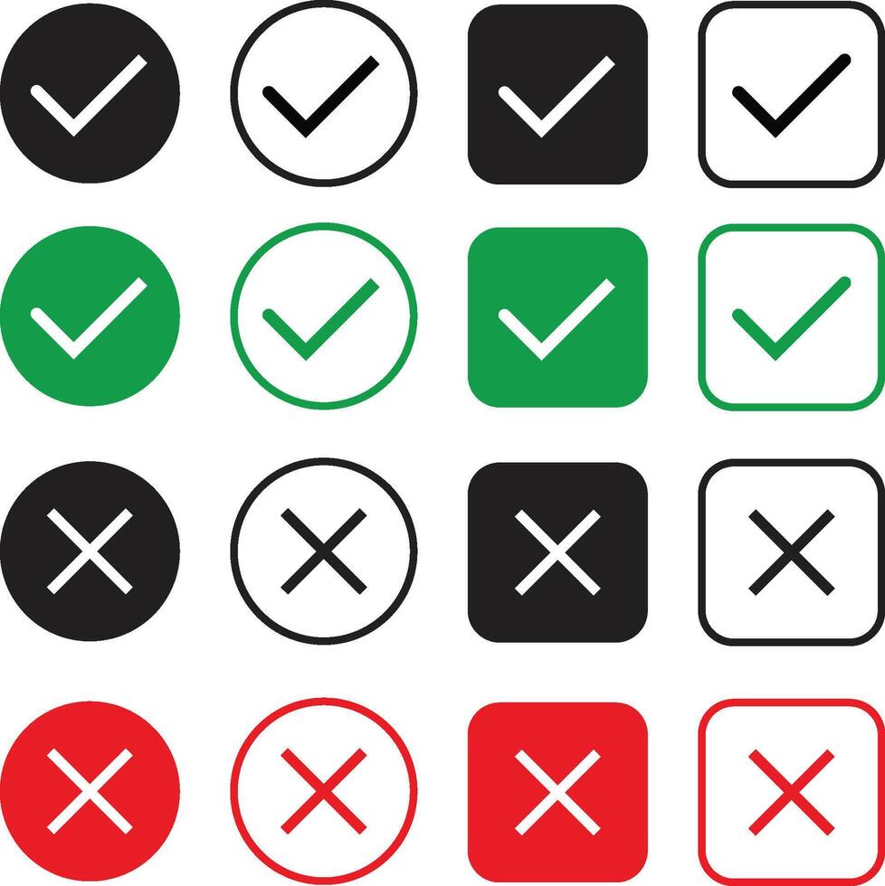 Check mark and cross mark icon set. Check mark with right and wrong sign. Tick and cross icon set. Green check button and red wrong button. Pro Vector