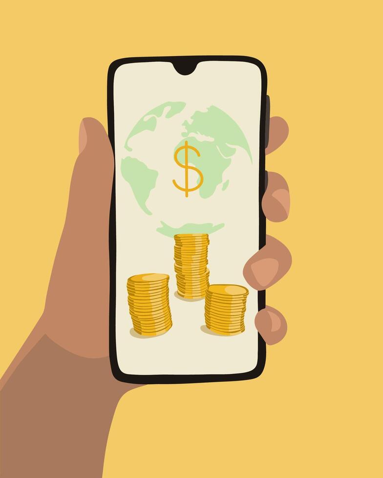 A hand presents a smartphone that features a globe and stacks of coins symbolizing a global financial network and economic activity Pro Vector