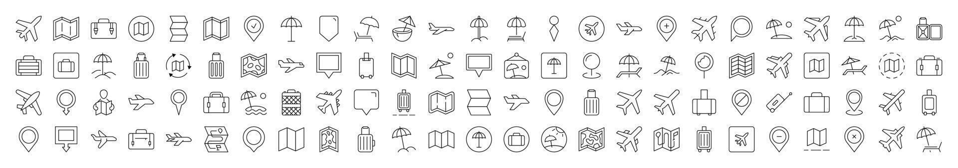 Line Icon Set of Vacation. Contains Icons of Plane, Map, Location, Beach Umbrella that Can Be Used for Design of Cards, Posts, Apps, Web Sites Pro Vector