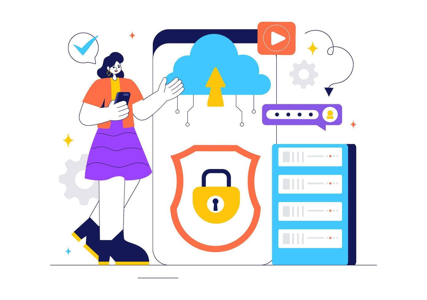 Secure Cloud Data and Backup Illustration with Network Safety Features Pro Vector