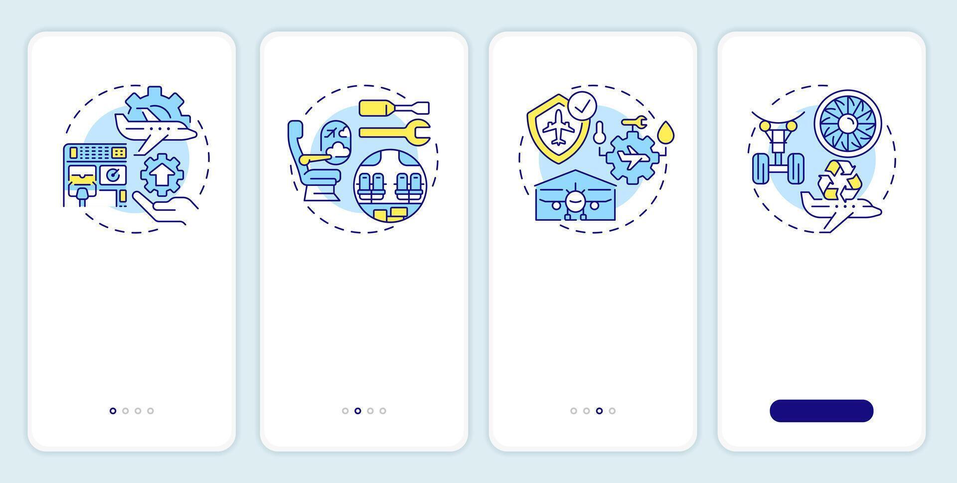 Aircraft maintenance onboarding mobile app screen. Walkthrough 4 steps editable graphic instructions with linear concepts. UI, UX, GUI template Pro Vector