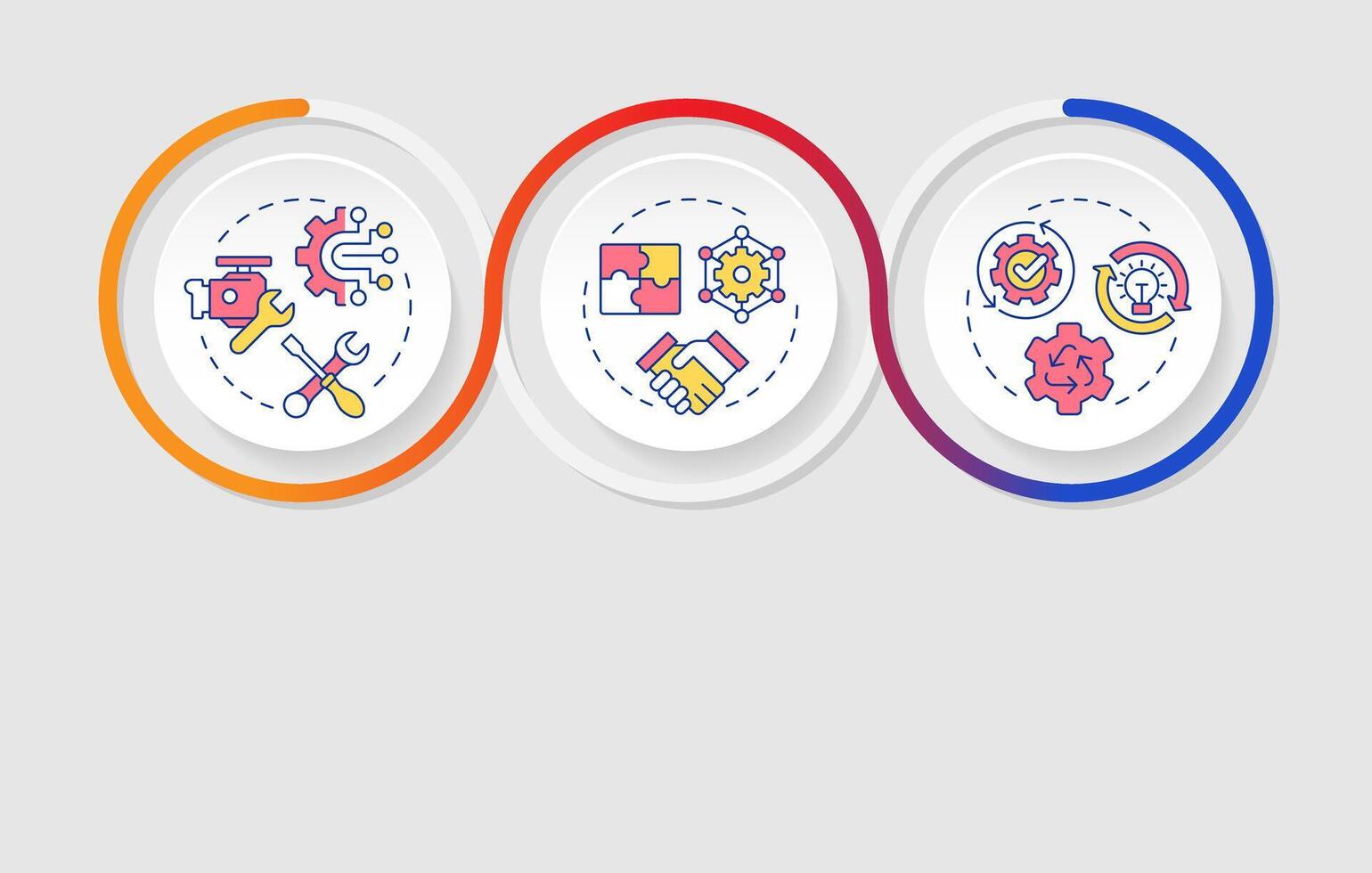 Reverse engineering uses infographics circles sequence. Parts repair and maintenance service. Visualization layout with 3 steps. Info chart loop process presentation Pro Vector