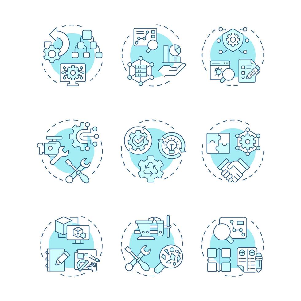 Reengineering soft blue concept icons. Reverse engineering. Product disassembly, repurposing. Model creation process. Icon pack. Round shape illustrations. Abstract idea Pro Vector